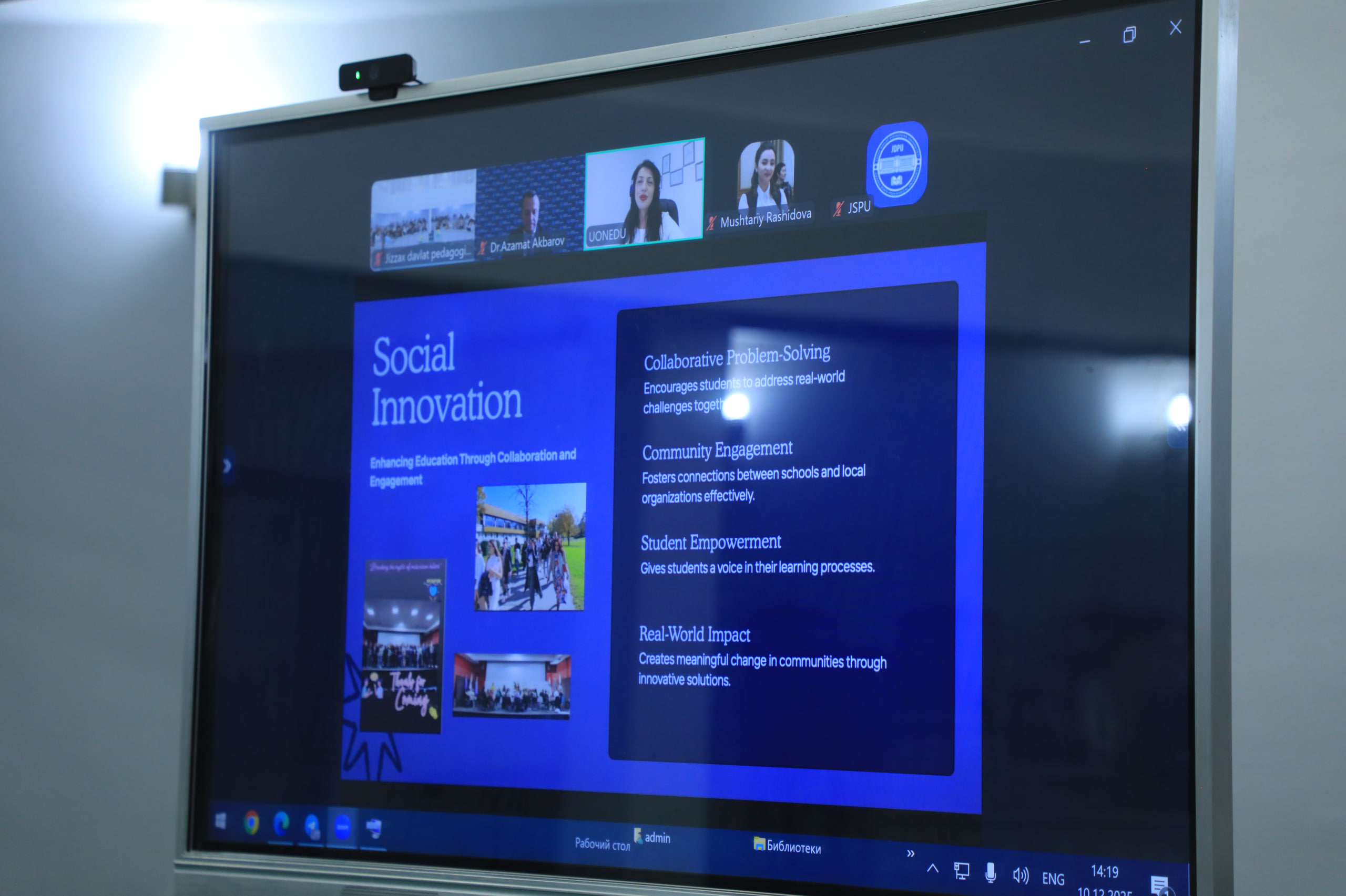 Vebinar jarayonida XXI asr ta’limida raqamli pedagogika, ijtimoiy innovatsiyalar va til o‘rganish jarayonlarini integratsiyalashtirishning zamonaviy yondashuvlari muhokama qilindi. Spiker o‘z tajribasi asosida innovatsion o‘qitish amaliyotlari, ta’lim muhitini raqamlashtirish va interfaol metodlardan samarali foydalanish bo‘yicha qator muhim tavsiyalar berdi.