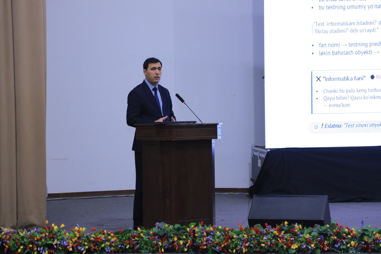 Seminar ishini Maktabgacha va maktab ta’limi vazirligi huzuridagi Pedagog kadrlarga malaka toifalarini berish jarayonini tashkil etish va kasbiy sertifikatlash boshqarmasi boshlig‘i Dusnazarov Umidjon Muminjonovich davom ettirib, test topshiriqlarini ishlab chiqish, baholash mezonlarini belgilash hamda natijalarni tahlil qilish bo‘yicha amaliy tushunchalar berdi.
