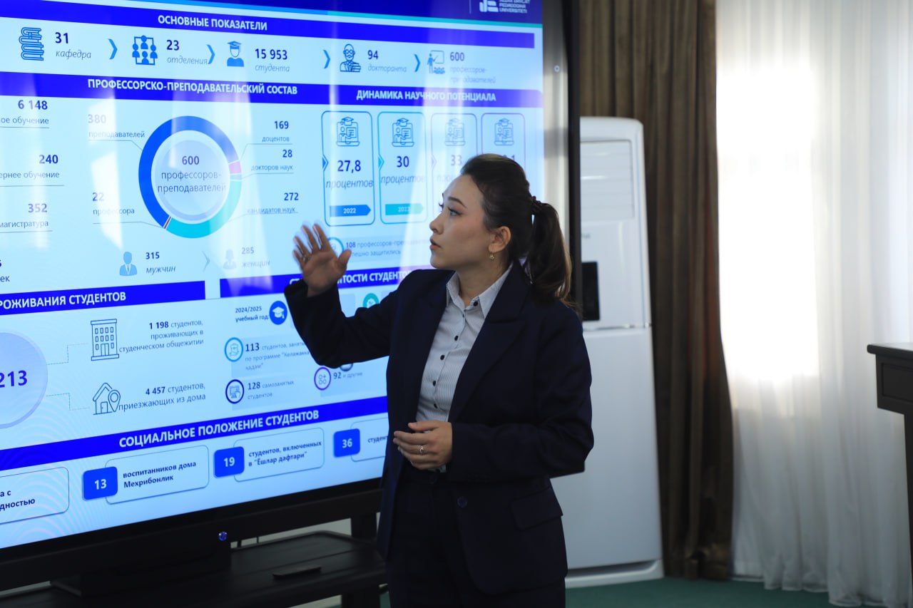 Uchrashuv universitet rektori M.A. Yuldashevning Jizzax viloyatining iqtisodiy salohiyati va asosiy rivojlanish drayver yo‘nalishlari haqidagi ma’lumotlari bilan boshlandi. Shuningdek, universitet faoliyati, xususan, tibbiyot fakulteti haqida atroflicha axborot berildi. Uchrashuv davomida viloyat va universitet haqida tayyorlangan videoroliklar namoyish etildi hamda mehmonlarga universitet taqdimoti taqdim qilindi.