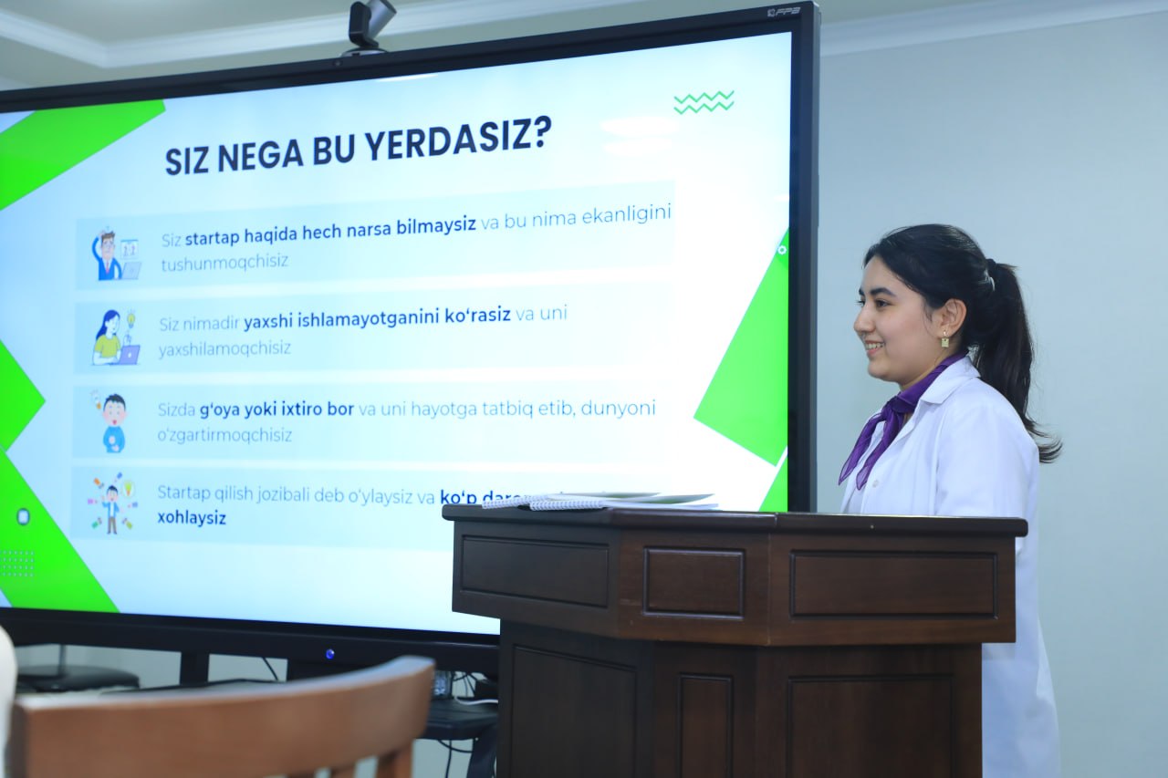 Tadbir davomida ishtirokchilarga startaplarni rivojlantirish bosqichlari, yuzaga keladigan muammolarni samarali hal etish mexanizmlari, jamoa bilan ishlash, investitsiya jalb qilish va barqaror biznes modellarni shakllantirish bo‘yicha atroflicha ma’lumotlar taqdim etildi.